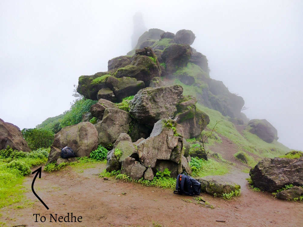 Take the mud trail in south-west from Irshalwadi (keeping Irshalgad to your right) and proceed for 300 m, crossing a temple and couple of seasonal streams along the way to reach a pass. Turn right (usually marked by a shoe/bottle on a twig) and climb the rocky trail to reach the main ridge. The way ahead is up the western face of the mountain. Negotiate a medium grade rock patch & a rickety vertical ladder to reach the Nedhe.